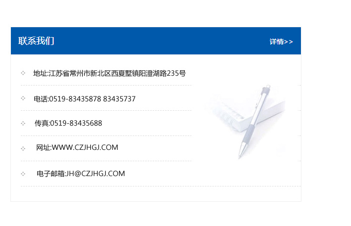 傳真:0519-83435688    郵編:213135    網址:WWW.czjhgj_com.t8dj.com    電子郵箱:JH@czjhgj_com.t8dj.com